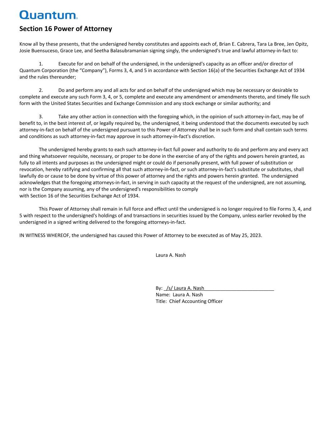 Section 16 Power of Attorney Know all by these presents, that the undersigned hereby constitutes and appoints each of, Brian E. Cabrera, Tara La Bree, Jen Opitz, Josie Buensuceso, Grace Lee, and Seetha Balasubramanian signing singly, the undersigned's true and lawful attorney-in-fact to: 1. Execute for and on behalf of the undersigned, in the undersigned's capacity as an officer and/or director of Quantum Corporation (the “Company”), Forms 3, 4, and 5 in accordance with Section 16(a) of the Securities Exchange Act of 1934 and the rules thereunder; 2. Do and perform any and all acts for and on behalf of the undersigned which may be necessary or desirable to complete and execute any such Form 3, 4, or 5, complete and execute any amendment or amendments thereto, and timely file such form with the United States Securities and Exchange Commission and any stock exchange or similar authority; and 3. Take any other action in connection with the foregoing which, in the opinion of such attorney-in-fact, may be of benefit to, in the best interest of, or legally required by, the undersigned, it being understood that the documents executed by such attorney-in-fact on behalf of the undersigned pursuant to this Power of Attorney shall be in such form and shall contain such terms and conditions as such attorney-in-fact may approve in such attorney-in-fact's discretion. The undersigned hereby grants to each such attorney-in-fact full power and authority to do and perform any and every act and thing whatsoever requisite, necessary, or proper to be done in the exercise of any of the rights and powers herein granted, as fully to all intents and purposes as the undersigned might or could do if personally present, with full power of substitution or revocation, hereby ratifying and confirming all that such attorney-in-fact, or such attorney-in-fact's substitute or substitutes, shall lawfully do or cause to be done by virtue of this power of attorney and the rights and powers herein granted. The undersigned acknowledges that the foregoing attorneys-in-fact, in serving in such capacity at the request of the undersigned, are not assuming, nor is the Company assuming, any of the undersigned's responsibilities to comply with Section 16 of the Securities Exchange Act of 1934. This Power of Attorney shall remain in full force and effect until the undersigned is no longer required to file Forms 3, 4, and 5 with respect to the undersigned's holdings of and transactions in securities issued by the Company, unless earlier revoked by the undersigned in a signed writing delivered to the foregoing attorneys-in-fact. IN WITNESS WHEREOF, the undersigned has caused this Power of Attorney to be executed as of May 25, 2023. Laura A. Nash By: _/s/ Laura A. Nash__________________________ Name: Laura A. Nash Title: Chief Accounting Officer