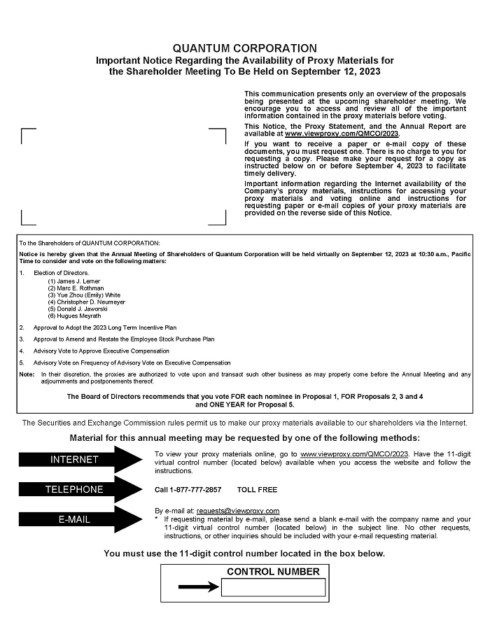 QUANTUM CORPORATION Important Notice Regarding the Availability of Proxy Materials for the Shareholder Meeting To Be Held on September 12, 2023 This communication presents only an overview of the proposals being presented at the upcoming shareholder meeting. We encourage you to access and review all of the important information contained in the proxy materials before voting. This Notice, the Proxy Statement, and the Annual Report are available at www.viewproxy.com/QMCO/2023. If you want to receive a paper or e-mail copy of these documents, you must request one. There is no charge to you for requesting a copy. Please make your request for a copy as instructed below on or before September 4, 2023 to facilitate timely delivery. Important information regarding the Internet availability of the Company’s proxy materials, instructions for accessing your proxy materials and voting online and instructions for requesting paper or e-mail copies of your proxy materials are provided on the reverse side of this Notice. To the Shareholders of QUANTUM CORPORATION: Notice is hereby given that the Annual Meeting of Shareholders of Quantum Corporation will be held virtually on September 12, 2023 at 10:30 a.m., Pacific Time to consider and vote on the following matters: 1. Election of Directors. (1) James J. Lerner (2) Marc E. Rothman (3) Yue Zhou (Emily) White (4) Christopher D. Neumeyer (5) Donald J. Jaworski (6) Hugues Meyrath 2. Approval to Adopt the 2023 Long Term Incentive Plan 3. Approval to Amend and Restate the Employee Stock Purchase Plan 4. Advisory Vote to Approve Executive Compensation 5. Advisory Vote on Frequency of Advisory Vote on Executive Compensation Note: In their discretion, the proxies are authorized to vote upon and transact such other business as may properly come before the Annual Meeting and any adjournments and postponements thereof. The Board of Directors recommends that you vote FOR each nominee in Proposal 1, FOR Proposals 2, 3 and 4 and ONE YEAR for Proposal 5. The Securities and Exchange Commission rules permit us to make our proxy materials available to our shareholders via the Internet. Material for this annual meeting may be requested by one of the following methods: To view your proxy materials online, go to www.viewproxy.com/QMCO/2023. Have the 11-digit virtual control number (located below) available when you access the website and follow the instructions. Call 1-877-777-2857 TOLL FREE By e-mail at: requests@viewproxy.com * If requesting material by e-mail, please send a blank e-mail with the company name and your 11-digit virtual control number (located below) in the subject line. No other requests, instructions, or other inquiries should be included with your e-mail requesting material. You must use the 11-digit control number located in the box below. CONTROL NUMBER