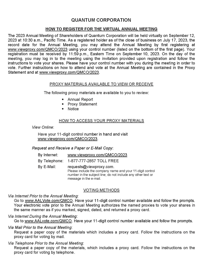 QUANTUM CORPORATION HOW TO REGISTER FOR THE VIRTUAL ANNUAL MEETING The 2023 Annual Meeting of Shareholders of Quantum Corporation will be held virtually on September 12, 2023 at 10:30 a.m., Pacific Time. As a registered holder as of the close of business on July 17, 2023, the record date for the Annual Meeting, you may attend the Annual Meeting by first registering at www.viewproxy.com/QMCO/2023 using your control number (listed on the bottom of the first page). Your registration must be received by 11:59 p.m., Eastern Time on September 10, 2023. On the day of the meeting, you may log in to the meeting using the invitation provided upon registration and follow the instructions to vote your shares. Please have your control number with you during the meeting in order to vote. Further instructions on how to attend and vote at the Annual Meeting are contained in the Proxy Statement and at www.viewproxy.com/QMCO/2023. PROXY MATERIALS AVAILABLE TO VIEW OR RECEIVE The following proxy materials are available to you to review: • Annual Report • Proxy Statement • Notice HOW TO ACCESS YOUR PROXY MATERIALS View Online: Have your 11-digit control number in hand and visit www.viewproxy.com/QMCO/2023. Request and Receive a Paper or E-Mail Copy: By Internet: www.viewproxy.com/QMCO/2023 By Telephone: 1-877-777-2857 TOLL FREE By E-Mail: requests@viewproxy.com. Please include the company name and your 11-digit control number in the subject line; do not include any other text or message in the e-mail. VOTING METHODS Via Internet Prior to the Annual Meeting: Go to www.AALVote.com/QMCO. Have your 11-digit control number available and follow the prompts. Your electronic vote prior to the Annual Meeting authorizes the named proxies to vote your shares in the same manner as if you marked, signed, dated, and returned a proxy card. Via Internet During the Annual Meeting: Go to www.AALvote.com/QMCO. Have your 11-digit control number available and follow the prompts. Via Mail Prior to the Annual Meeting: Request a paper copy of the materials which includes a proxy card. Follow the instructions on the proxy card for voting by mail. Via Telephone Prior to the Annual Meeting: Request a paper copy of the materials, which includes a proxy card. Follow the instructions on the proxy card for voting by telephone.